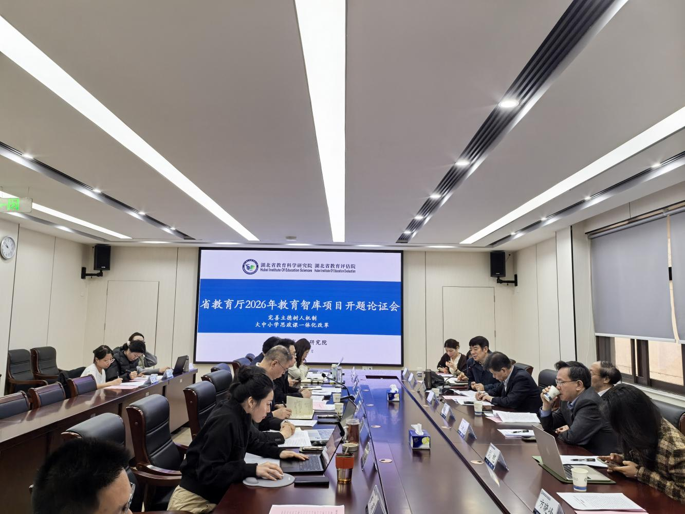 2026 年 4 月 23 日上午,省教育厅2026年教育智库项目“完善立德树人机制”“大中小学思政课一体化改革”开题论证在省教科院举行,该项目由湖北教育政策研究院承担。项目组邀请中国地质大学马克思主义学院博士生导师李祖超教授、华中师范大学教育学院博士生导师杜时忠教授、武汉理工大学马克思主义学院博士生导师李志峰教授、华中师范大学马克思主义学院博士生导师王忠文教授和刘艳博士后到会指导。省教科院党委委员、副院长王一凡研究员出席会议,并就课题研究提出明确要求。